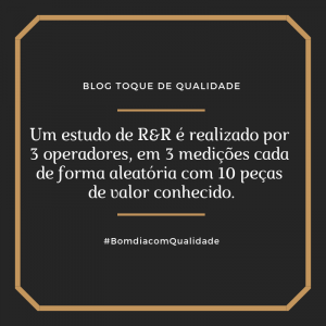 Um estudo de R&R é realizado por 3 operadores, em 3 medições cada de forma aleatória com 10 peças de valor conhecido.