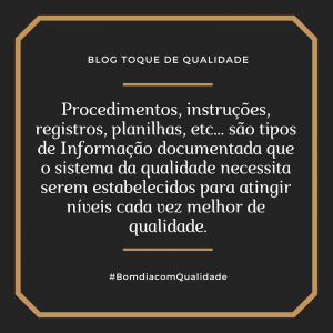 Procedimentos, instruções, registros, planilhas, etc… são tipos de Informação documentada que o sistema da qualidade necessita serem estabelecidos para atingir níveis cada vez melhor de qualidade.