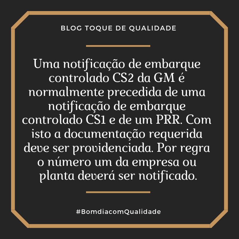 Uma notificação de embarque controlado CS2 da GM é normalmente precedida de uma notificação de embarque controlado CS1 e de um PRR. Com isto a documentação requerida deve ser providenciada. Por regra o número um da empresa ou planta deverá ser notificado.